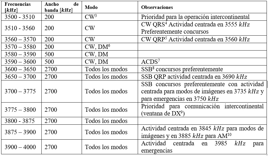 | longitud de onda | Usos Principales | | ---------------- | ---------------------------------------------------------------------------------------------------------------------------------------------------------------------------------------------------------------------------------------------------------------------------- | | 200 m | Permite comunicaciones de corto alcance durante horas diurnas y comunicaciones de mayor alcance durante horas diurnas y de mayor alcance en la noche. | | 630 m | Permite comunicaciones de corto alcance durante las horas diurnas y comunicaciones de mayor alcance a travéz de la refacción ionosférica durante la noche. | | 160 m | Corto alcance durante horas Diurnas y comunicaciones de medio y gran alcance en horas nocturnas. | | 80 m | Se utiliza para establecer contactos a distancias de hasta 500 km durante el día y a distancias de 2000 km o más durante la noche, es muy usada para comunicaciones de emergencia. | | 40 m | La banda de 7 MHz es muy utilizada las 24 horas del día, todos los días. Distancias menores a 1300 km. | | 30 m | Esta banda se usa las 24 horas del día y actúa como puente entre las bandas de 7 MHz y 14 MHz. | | 20 m | La banda más popular para comunicaciones internacionales, 14 MHz. | | 17 m | La banda se utiliza como alternativa a la banda de 14 MHZ que a menudo esta congestionada. | | 15 m | Estas bandas se emplean especialmente durante horas diurnas. | | 6 m | Se utiliza para comunicaciones locales en todo instante, llega hasta 2000 km. | | 2 m | Es intensamente utilizada para comunicaciones de corto alcance Tierra-Luna-Tierra (EME), llega a distancias de 2000 o 3000 km. | | 1.25 m | Sirve como alternativa a la banda de 144 MHz para comunicaciones de corto alcance. | | 70 cm | Se utiliza para comunicaciones de corto alcance, repetidores de televisión de aficionados. Para comunicaciones Tierra-Luna-Tierra (EME), cubre distancias de hasta 1000 km, también se usa para establecer contacto con los repetidores a bordo de satélites de aficionados. | | 33 cm | Esta atribuida al servicio de aficionados sólo en la región 2. | | 23 cm | Puede establecer comunicaciones a distancias de 1000 km, es la más popular para comunicaciones Tierra-Luna-Tierra, se usa para contactos a bordo de satélites de aficionados. | | 9 cm | Comunicaciones de banda estrecha, enlaces de datos y comunicaciones Tierra-Luna-Tierra. | | 5 cm | Igual que 9 cm. | | 3 cm | Comunicaciones de banda estrecha, banda amplia de corto alcance, televisión y comunicaciones Tierra-Luna-Tierra. | | 1 | Banda de 122 GHz y frecuencias superiores son muy utilizadas para banda estrecha y experimentación. |